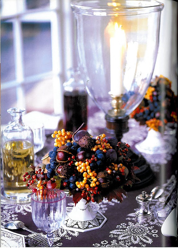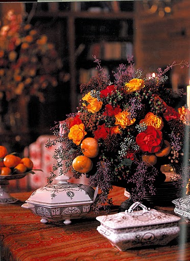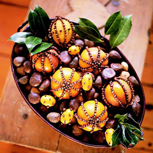 Sometimes, simple is best. Take a look at these acorn branches mixed with clemetines in a plain vase. Somehow, it works!