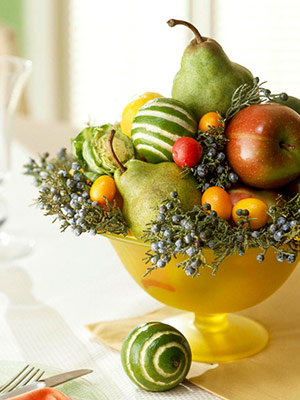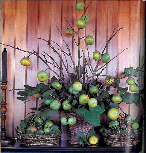 - Immature persimmons and granny smith apples create the unexpected pops of bright green color in this centerpiece.