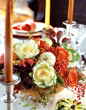 Pumpkins and herbs mixed together make this interesting centerpiece. Check the website for how-to instructions!