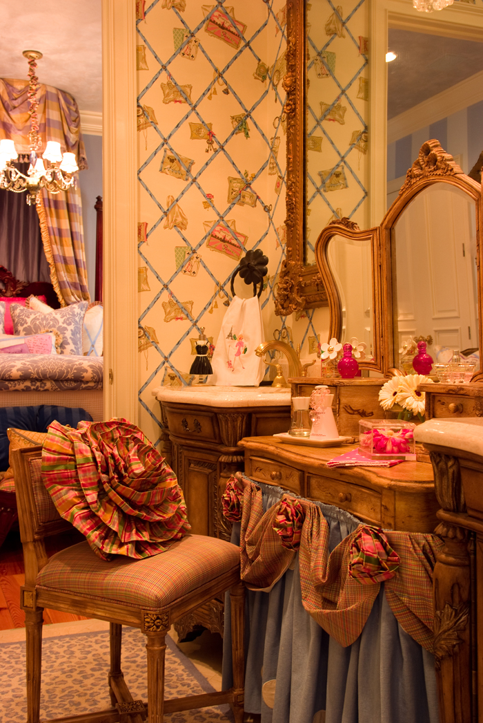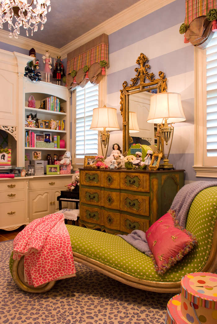 Today, I have a FABULOUS child’s room to share with all of you that was designed for a very special little girl. Once she told me her favorite book was “Fancy Nancy”- and her Mommy agreed that she loved it, as well! – I knew immediately what the inspiration for her fairytale room would be! However, as we began making decisions about fabrics and accessories, we quickly realized that what would really suit them best is a room filled with a variety of the child’s favorite things. As you will see in the photos below, everywhere you look in this room is overflowing with FABULOUS, customized details. And just for the record, this real-life little “Fancy Nancy” is just as “girly” and precious as her adorable room!