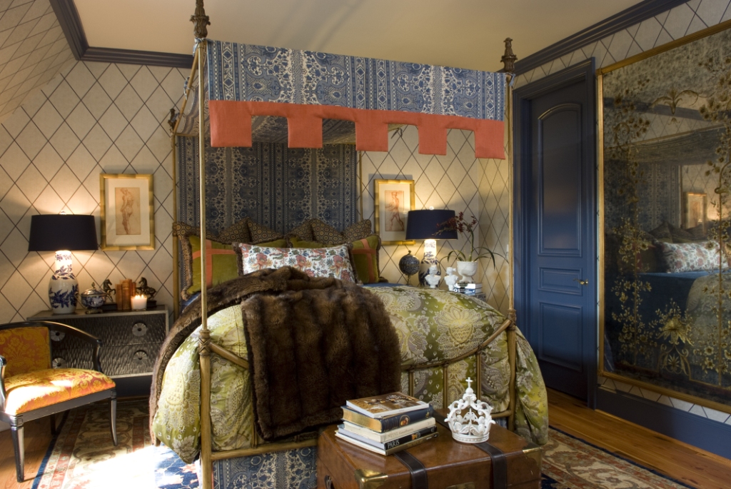 Here are a couple of photos of a bedroom I designed for some South Carolina interior design clients. Look at this gorgeous blue-and-white patterned fabric!