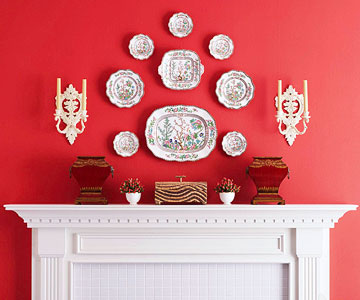 These two closely grouped collections of plates are purposely arranged to create height. Although there are many pieces of artwork grouped together, there is still an odd number in each of the two arrangements, which is more pleasing to the eye.