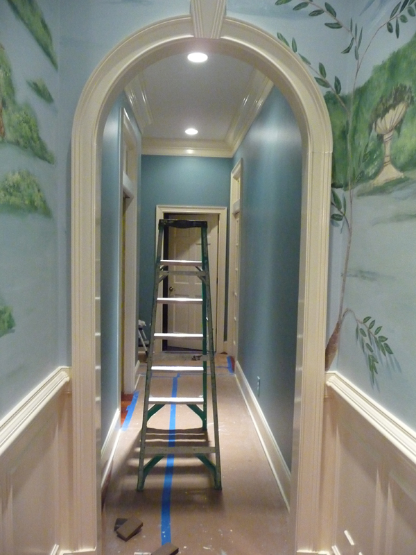 Here is a photo from earlier in the week showing the left side hallway that was supposed to have been completed by yesterday. The amazing color on the walls is called Boca Raton by Benjamin Moore.