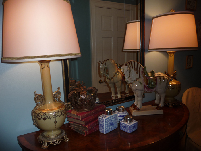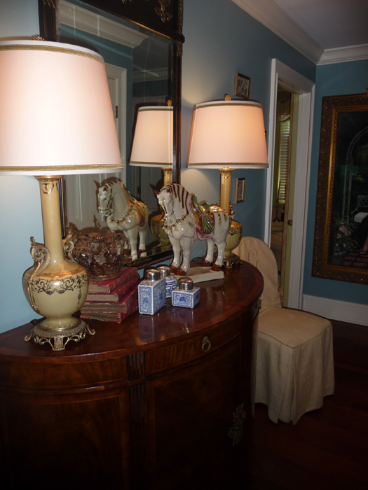 This tablescape comprises several things that I love.... blue pottery, a crown, and the large-scale horse statue on the right.