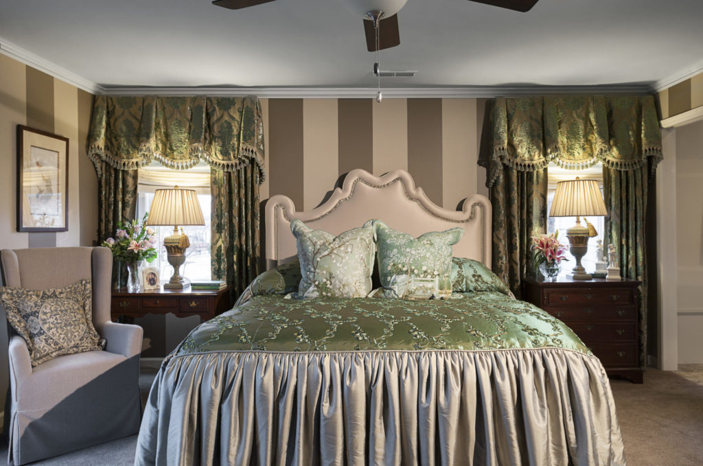 To dress up the master suite and make it appear larger, vertical stripes were incorporated. The use of painted stripes is a signature of ours and we’ve employed them in all fashions. In this case, the goal was to make the ceilings look taller yet, to keep the space calm and restful, the stripes were done in a soft tone on tone mocha!  Custom made drapery and bedding completed the comfortable luxurious feeling.