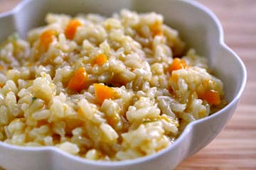 2 Add rice to onion and squash. Cook 1 to 2 minutes. Add wine. Cook, stirring constantly until wine has been absorbed by the rice or evaporated. Add a few ladles of broth, just enough to barely cover rice. Cook over medium heat until broth has been absorbed. Continue cooking and stirring rice, adding a little bit of broth at a time, cooking and stirring until it is absorbed, until the rice is tender, but still firm to the bite, about 15 to 20 minutes.