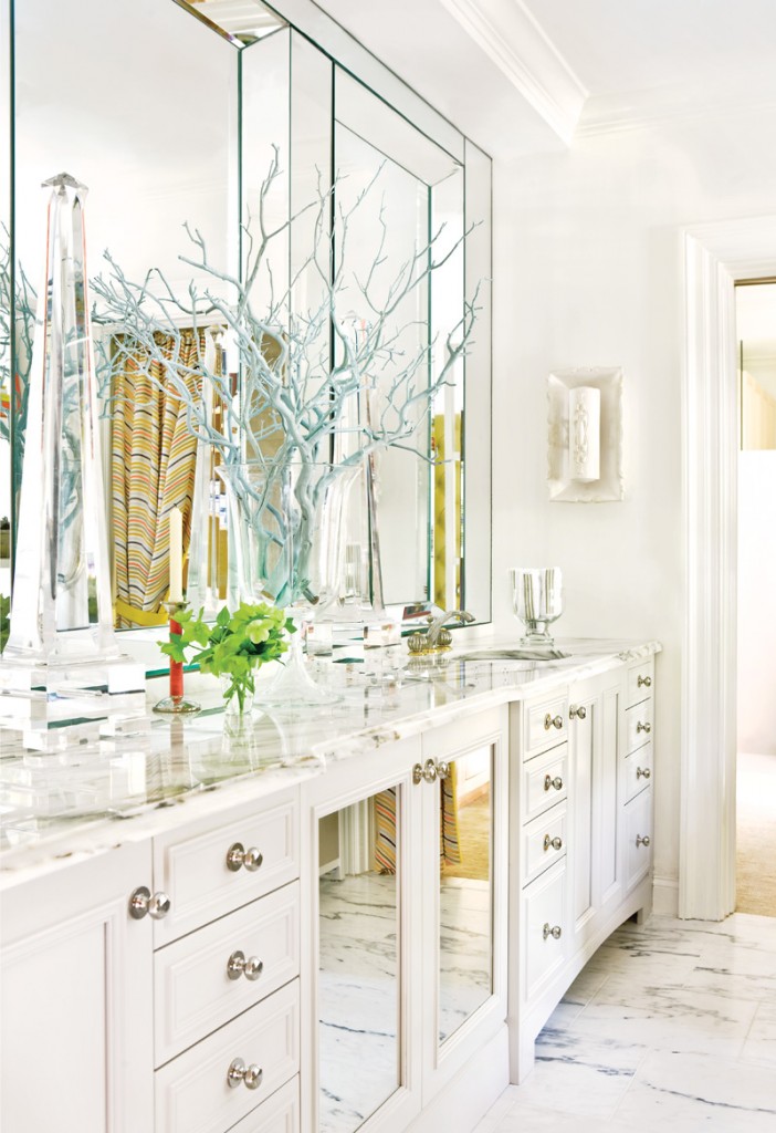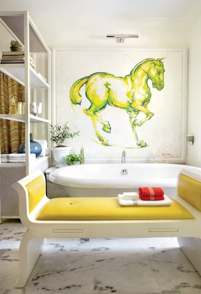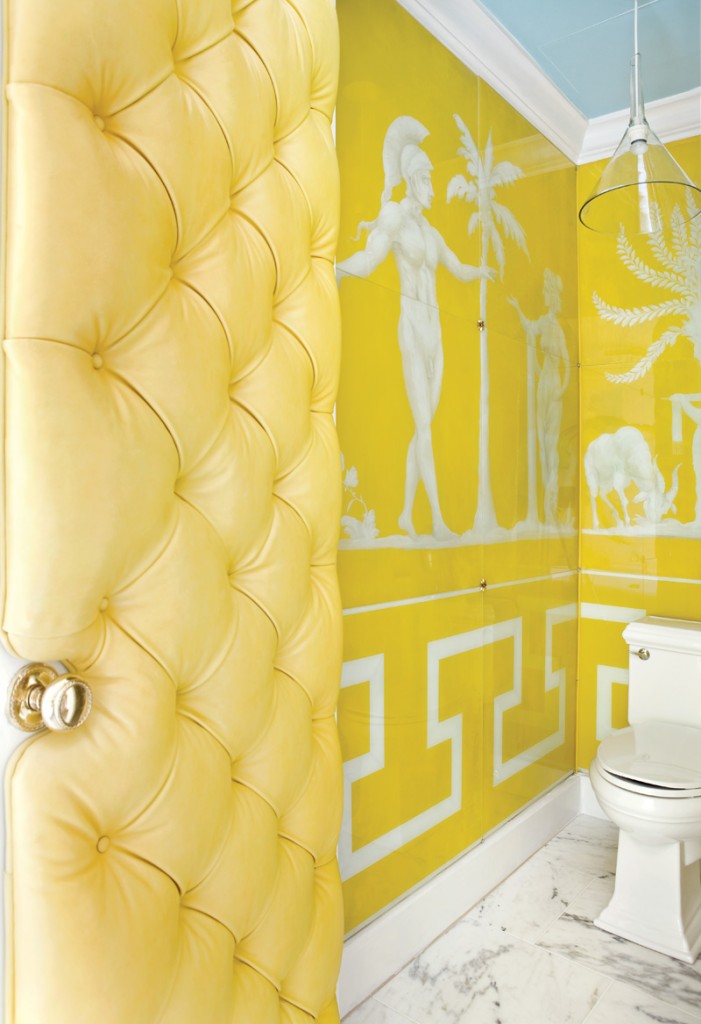 “It’s So Fabulous!” DESIGN ROOM of the Week: As promised, here are the new online photos of the FABULOUS bathroom from the the Atlanta Decorators’ Show House and Gardens 2010. They finally surfaced on the website of Atlanta Homes & Lifestyles. This bathroom was created by artist and designer, Raymond Goins, and includes one of his very own abstract horse paintings, floor-to-ceiling verre églomisé panels in the water closet, and a luxurious (and fabulous!) tufted-leather door! And guess what color he used in this to-die-for bathroom?! SUNNY YELLOW! (Ok, he actually calls it “saffron”, but it’s still yellow!).