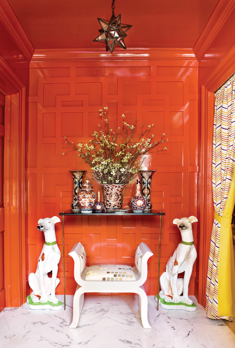 This photo is actually of the vestibule leading into the master bathroom. My assistant designer, Julie, LOVED this space! It features a lacquered trellised wall in a color called "persimmon".