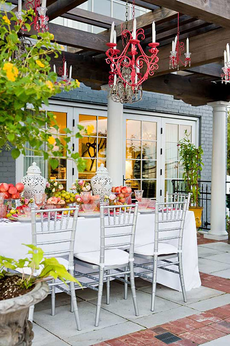The color pink adds a touch of playfulness to this elegant outdoor dining space.