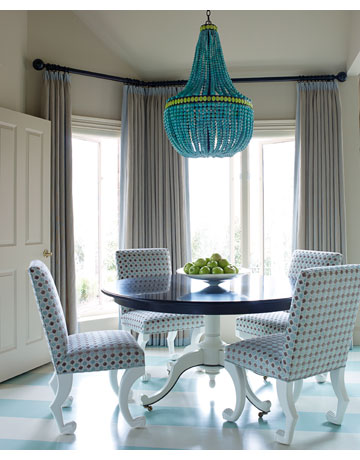 This bright turquoise chandelier stands out in this lovely, silver background.