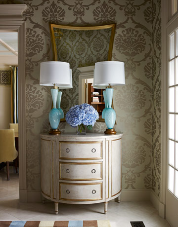 I love the elegant statement that these blue accents make against the dramatic, yet neutral, wallpaper.