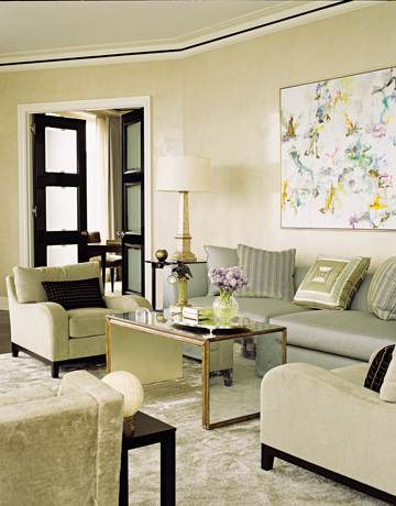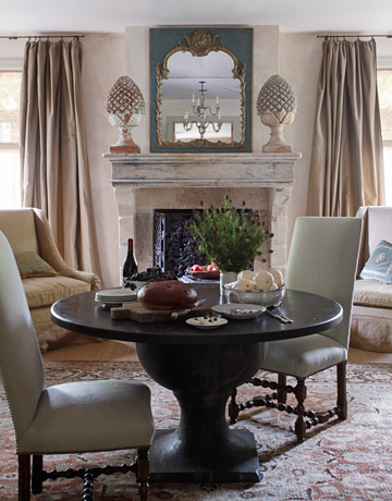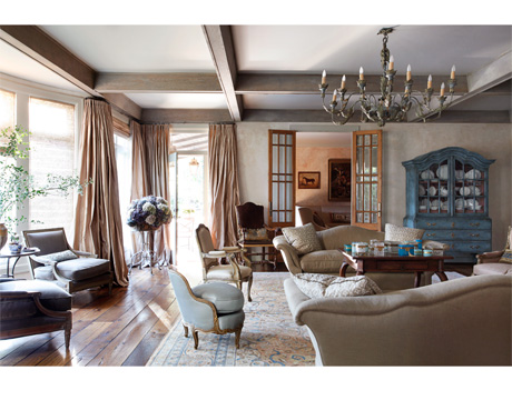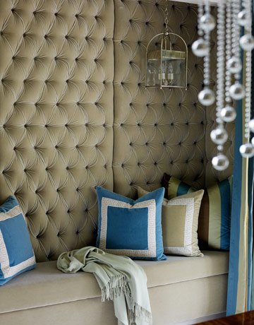 This room, by Tobi Fairly, has the perfect blend of blue against the tufted, beige backdrop. Absolute glamour!