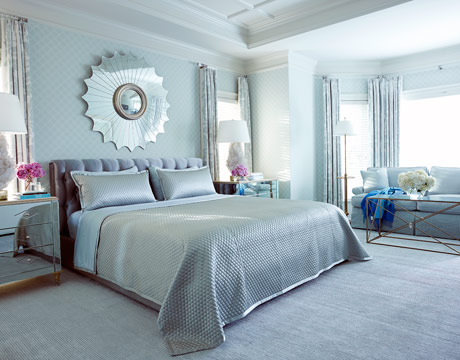 The soothing coolness of this bedroom can be attributed to the blue and silver combination.