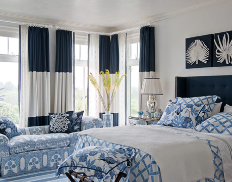 The window treatments and other blue fabrics are the perfect complement to the white walls and comforter.