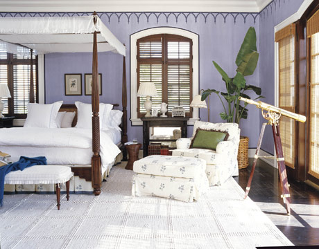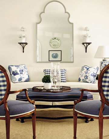 Although blue skies are the most perfect shade of color imaginable, blue, in general, is not always the easiest color in the rainbow to decorate with. In fact, as many of my interior design clients have discovered, blue can be downright difficult! There are so many options available that qualify as “blue”, including those with heavy doses of gray and green. Depending upon the light in your space, and the furniture and accessories you plan to use,  the blue you select for your decor should be chosen carefully, since this color can quickly become overwhelming, and as my friend, Susan, has said…. “just too blue”.  Here are a few examples of some guidelines to remember when decorating with shades of blue. (Photos from House Beautiful.)
