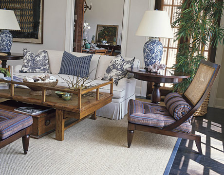 The blues in this living room appear bolder next to the purity of the white sofa and walls.
